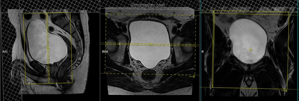 A three-plane T2-weighted HASTE localizer must be taken initially to localize and plan the sequences. These fast, single-shot localizers usually have an acquisition time of less than 25 seconds, which is excellent for localizing pelvic structures.