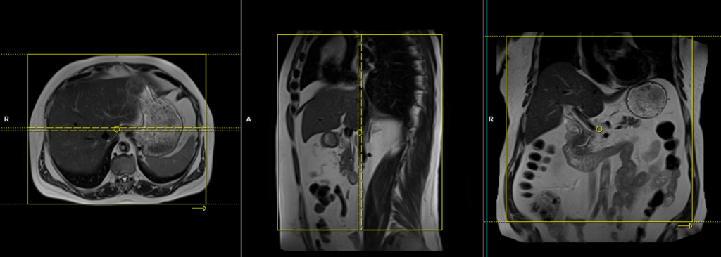 To localize and plan the sequences, it is essential to acquire a three-plane T2 HASTE localizer initially. These fast single-shot localizers have an acquisition time of under 25 seconds and are highly effective in accurately localizing abdominal structures.