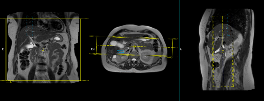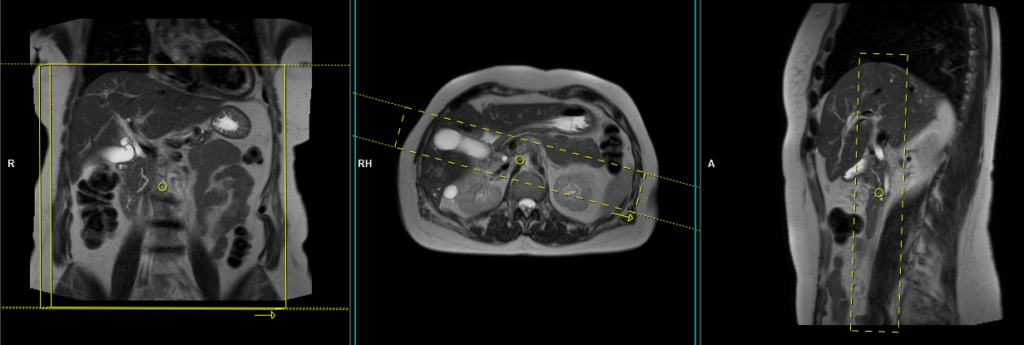 Plan the axial slices on the coronal breath hold images and position the block horizontally across the liver as shown. Verify the positioning in the other two planes. Establish an appropriate angle in the sagittal plane, aligning it horizontally across the liver. The slices must be sufficient to cover the entire liver from the diaphragm down to the C loop of the duodenum. The phase direction should be from right to left to minimize ghosting artifacts from the anterior abdominal wall. Use phase oversampling to prevent wrap-around artifacts. Instruct the patient to hold their breath during image acquisition. (In our department, we typically instruct patients to take two breaths in and out before providing the “breathe in and hold” instruction.)