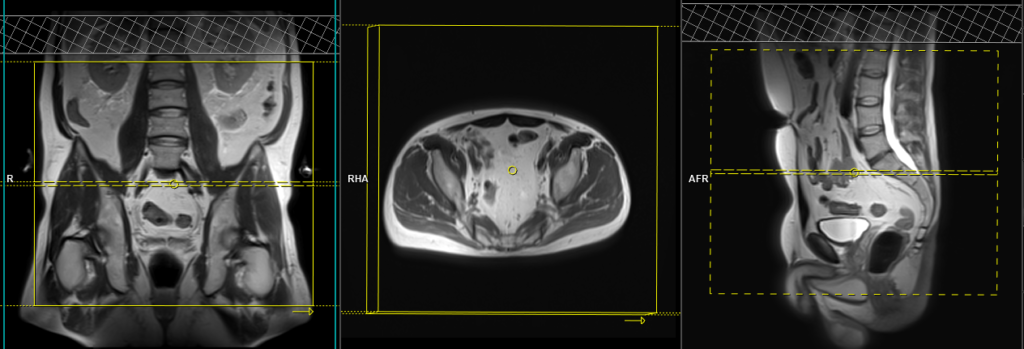 A three-plane HASTE localizer must be taken initially to localize and plan the sequences. These are fast, single-shot localizers with under 25s acquisition time, which are excellent for localizing abdominal and pelvic structures.