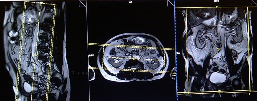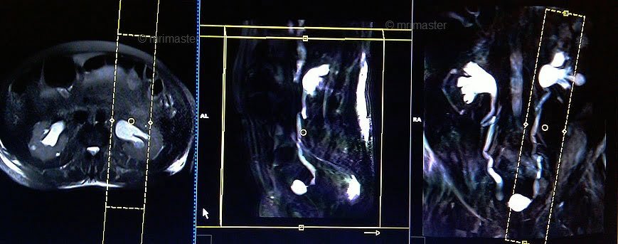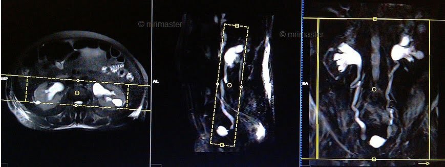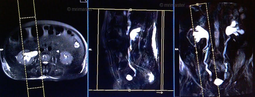 Plan the sagittal slice on the coronal plane; angle the positioning block parallel to the right ureter. Check the positioning block in the other two planes. An appropriate angle must be given in the axial plane (perpendicular to the right kidney calyx). Slice thickness must be sufficient to cover the whole ureter. Phase oversampling must be used to avoid wrap-around artifacts. The field of view (FOV) must be big enough to cover the kidneys and bladder. Instruct the patient to hold their breath during image acquisition.