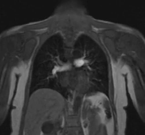 The care bolus image looks similar to the T1 localizer scans, with contrast in the blood vessels appearing bright during image acquisition.