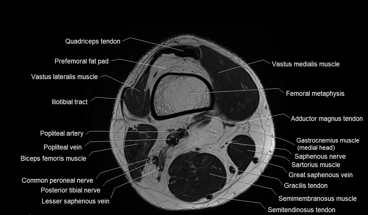 Interactive MRI knee axial anatomy viewer for studying cross sectional radiology anatomy of the knee.