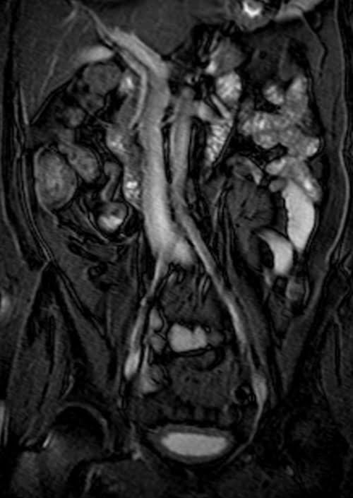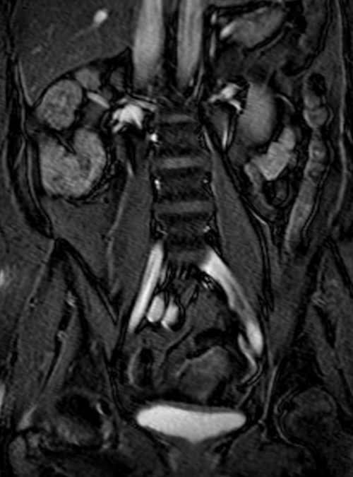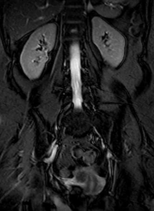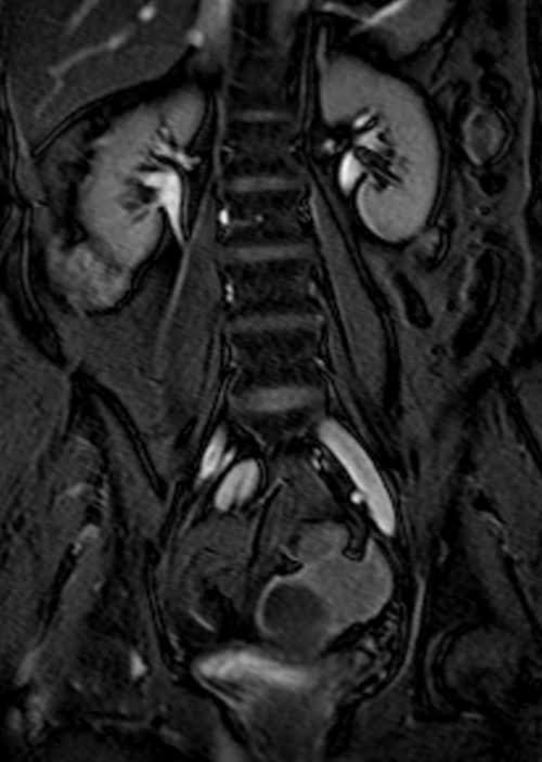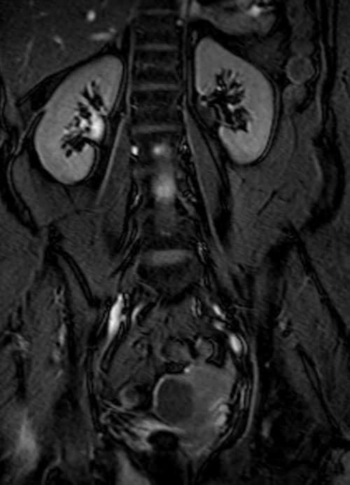 MRI kidney ureters and bladder( KUB) T2 TrueFISP fat saturated coronal images
